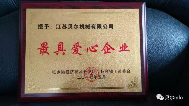 今天,江蘇貝爾機械榮獲經(jīng)濟技術(shù)開發(fā)區(qū)慈善會頒發(fā)的‘最具愛心企業(yè)’稱號。